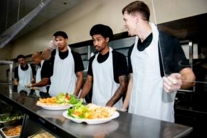视频中几人学习着如何配餐,脸上洋溢着笑容。